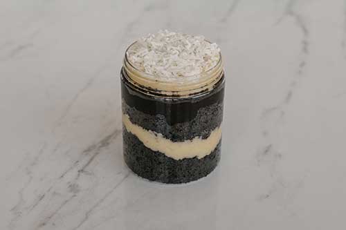 Coconut Beijinho frosting and Brigadeiro chocolate frosting nestled between layers of decadent chocolate cake. Beijinho is a condensed milk dessert made with coconut.
